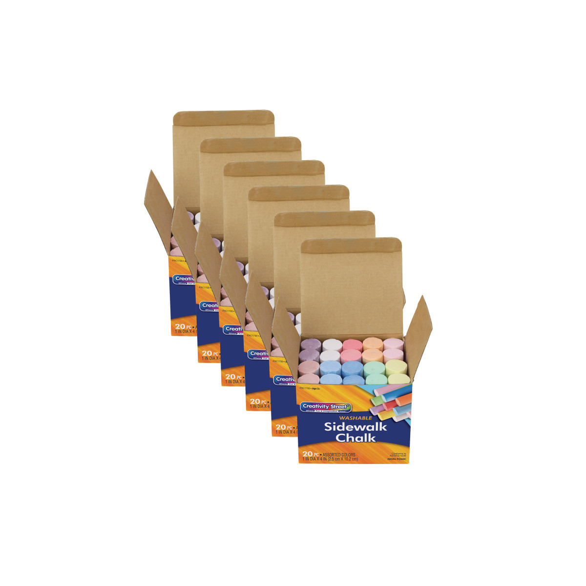 Now kids can decorate the sidewalks on Creativity Street! Sturdy corrugated storage box features a lock-tab to keep flap secure when not in use. Large 4" x 1" diameter chalk pieces are easy for small hands to hold. Non-toxic and washable. Each pack includes 20 pieces per box in bright colors. Sold as 6 boxes for a total of 120 pieces.