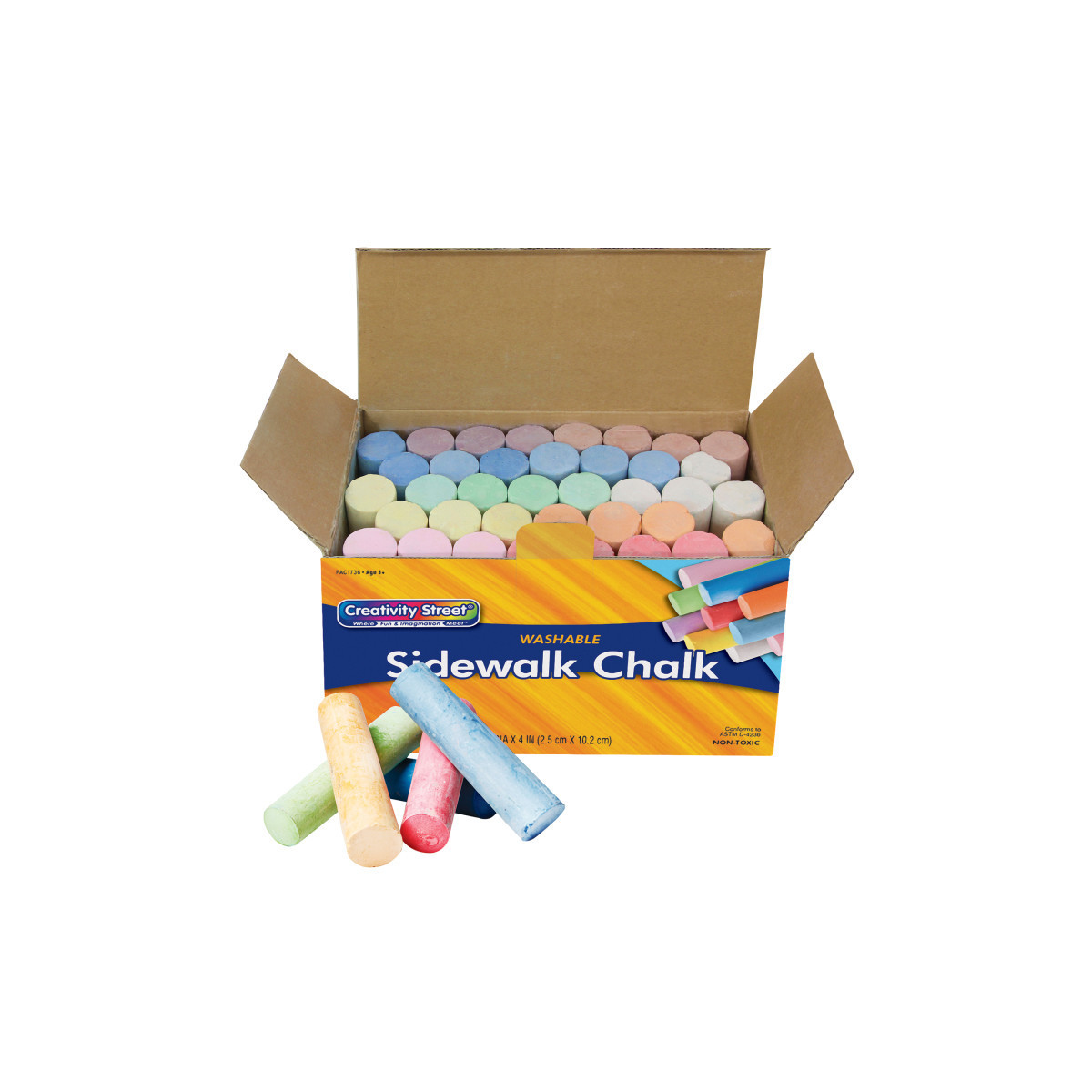Now kids can decorate the sidewalks on Creativity Street®! Sturdy corrugated storage box features a lock-tab to keep flap secure when not in use. Large 4" x 1" diameter chalk pieces are easy for small hands to hold. Non-toxic and washable. Colors include red, yellow, green, light blue, dark blue, orange, pink, white, brown, and purple. Includes 36 pieces.