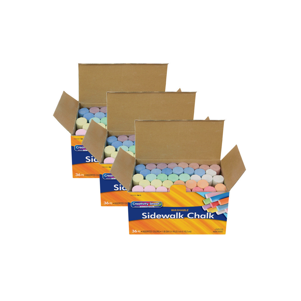 Now kids can decorate the sidewalks on Creativity Street®! Sturdy corrugated storage box features a lock-tab to keep flap secure when not in use. Large 4" x 1" diameter chalk pieces are easy for small hands to hold. Non-toxic and washable. Colors include red, yellow, green, light blue, dark blue, orange, pink, white, brown, and purple. Each pack includes 36 pieces. Sold as 3 packs for a total of 108 pieces.
