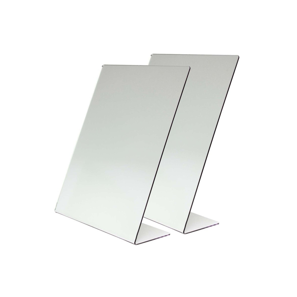 Great for self-portrait or for speech therapy exercises, this durable, scratch-resistant mirror is are 2 mm thick. Each mirror measures 8.5" x 11" with a 3" supporting base. Sold as a pack of 2.