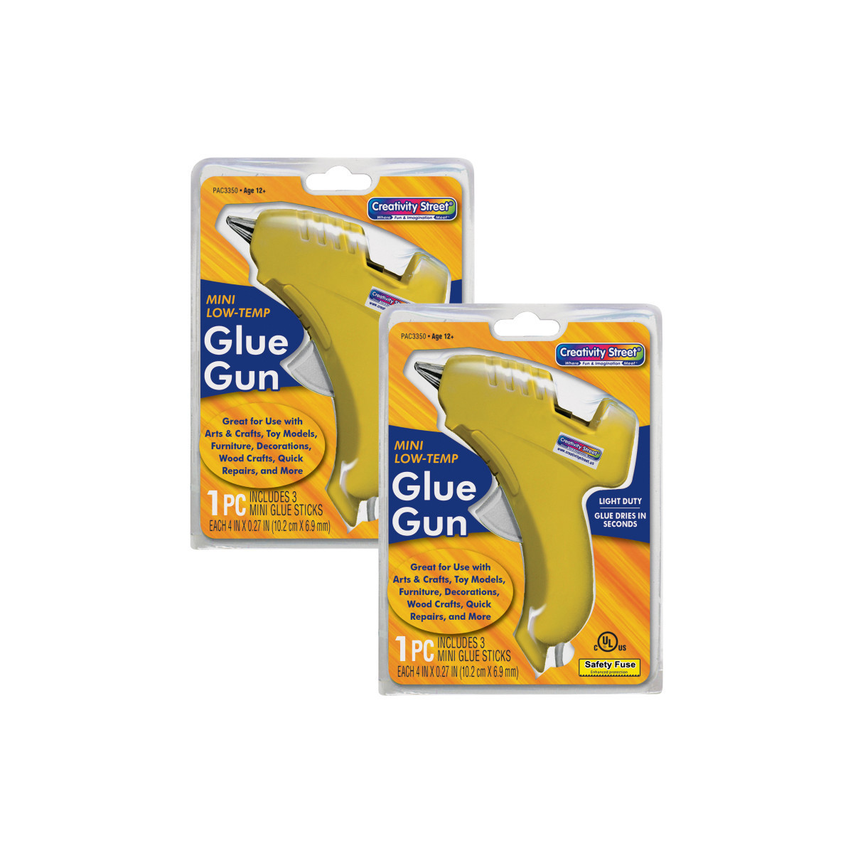 Mini-Glue Gun melts glue at 220 degrees F for safer use by young children. Uses 0.31" diameter glue sticks for quick repairs, toys and models, furniture, wood crafts and more. Plugs into any standard 120 volt electrical outlet. U.L. approved. Each glue gun comes with three glue sticks. For ages 5 and up. Sold as a pack of 2 glue guns.