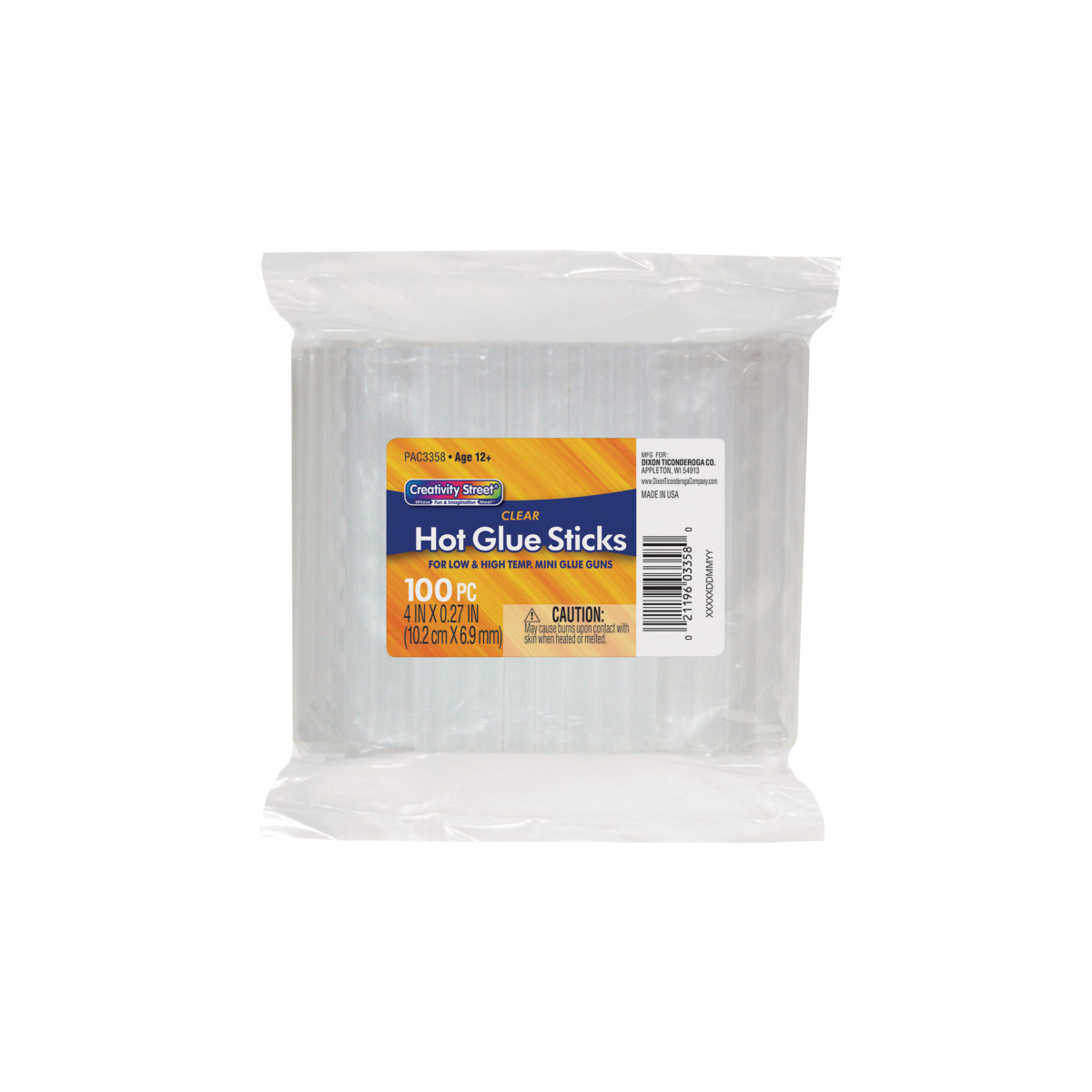 Clear, 4" x 0.31" diameter glue sticks are dual temperature, and can be used in all standard hot- and low-temp glue guns. Each pack includes 100 pieces.
