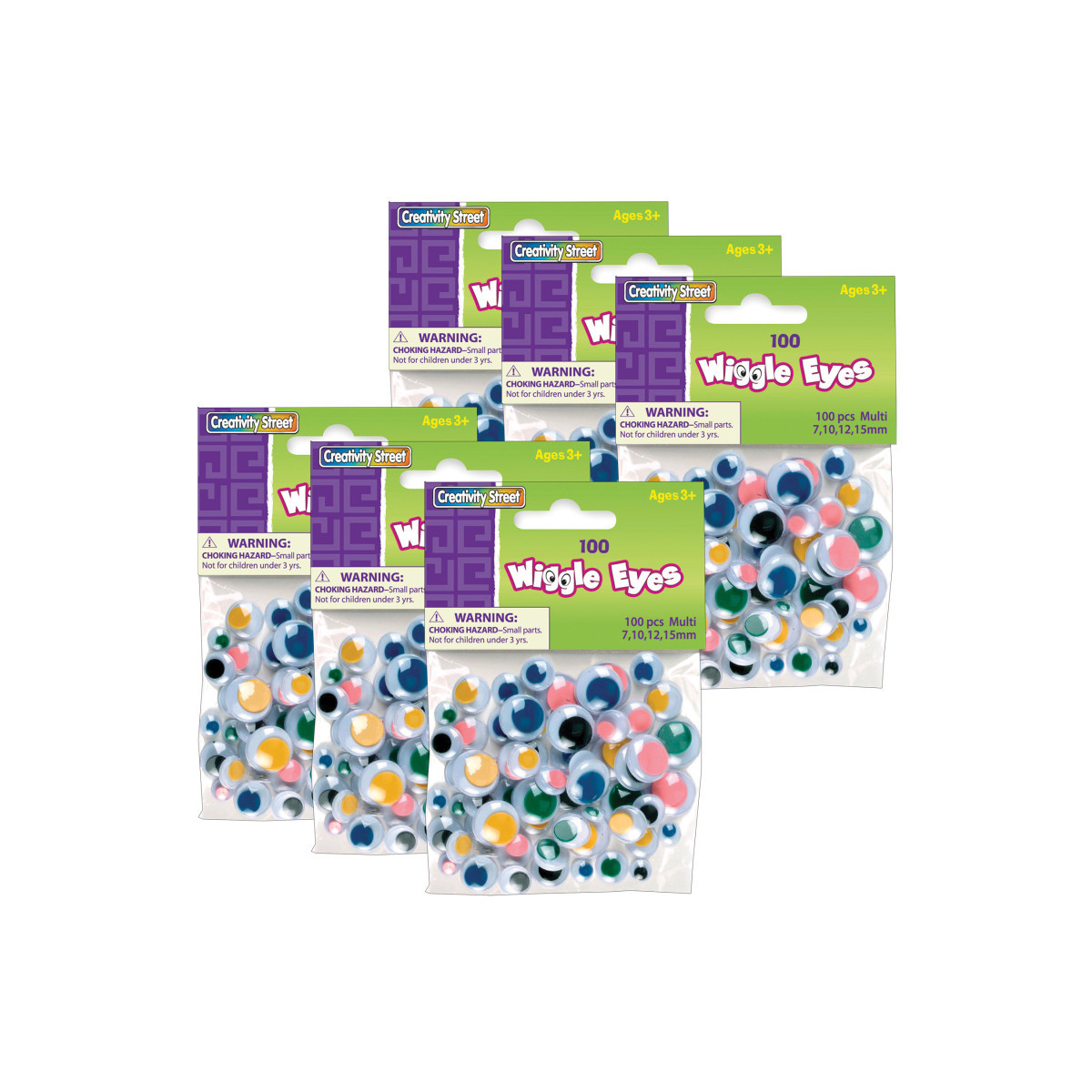 Wiggle Eyes bring projects to life! These multi-color eyes come in an assortment of sizes, and accept several types of glues and tapes to adhere to any project. Sizes include 25 each of 7 mm, 10 mm, 12 mm, and 15 mm. Ideal for the classroom, art room, daycare, or home. Each pack includes 100 pieces. Sold as 6 packs for a total of 600 wiggle eyes.