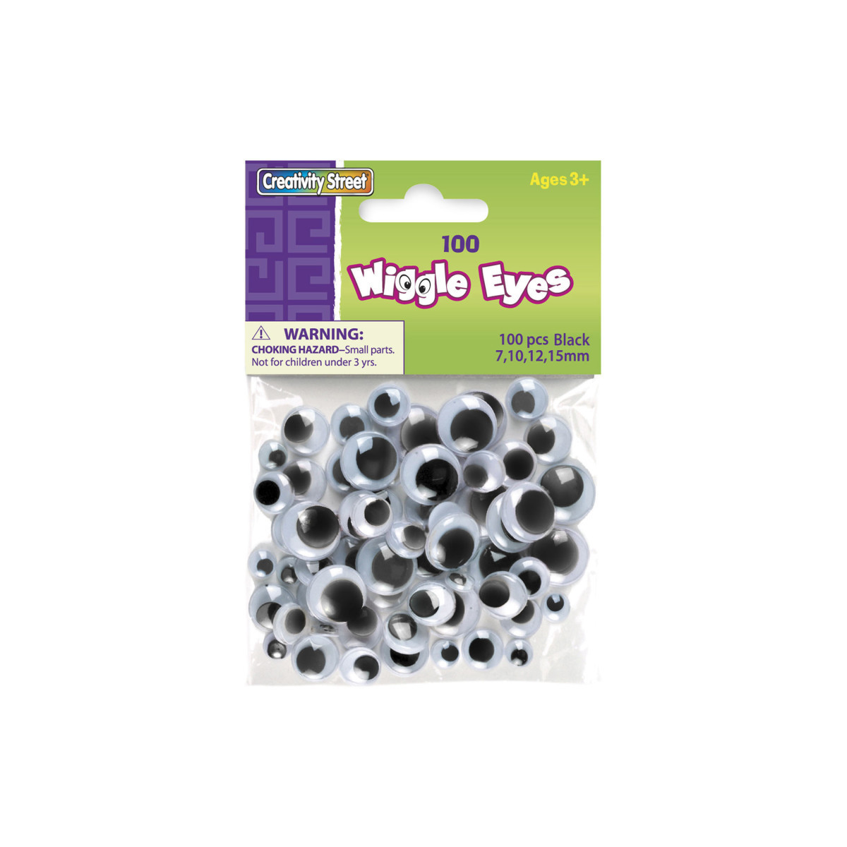 Wiggle Eyes bring projects to life! These black wiggle eyes come in an assortment of sizes, and accept several types of glues and tapes to adhere to any project. Sizes include 25 each of 7 mm, 10 mm, 12 mm, and 15 mm. Ideal for the classroom, art room, daycare, or home. Each pack includes 100 pieces.