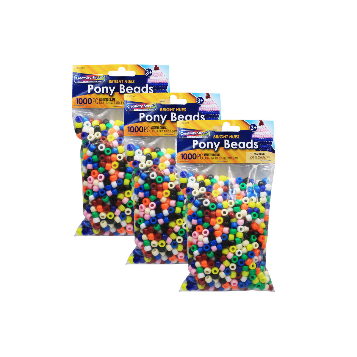 Plastic pony beads are perfect necklaces, bracelets, key chains, and more! The Bright Hues color assortment features several fun colors to make your projects stand out. Each bead measures 6 mm x 9 mm. Large pack size is perfect for parties, classrooms, and other large groups. Each pack includes 1000 beads in assorted bright hues. Sold as 3 packs, 3000 pieces total.