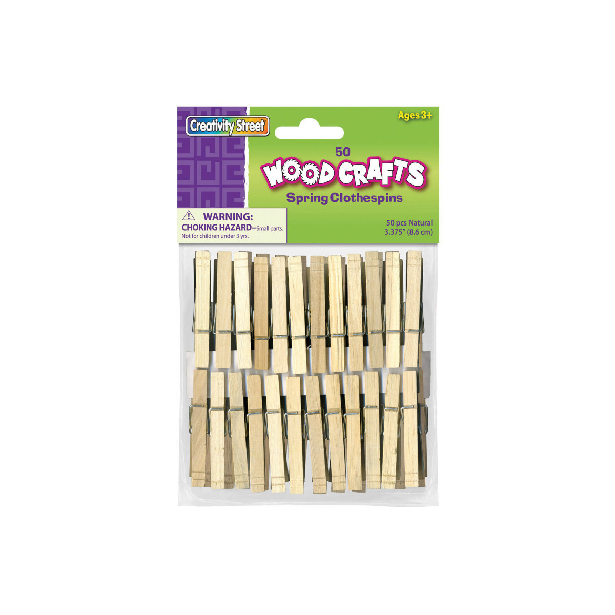 Natural wood spring clothespins are a great addition to any arts and crafts project. They are easy to paint and stain, and can be used to create animals, seasonal decorations and much more. Extra-Large Spring Clothespins are 3.38" in length. Each pack includes 50 pieces.