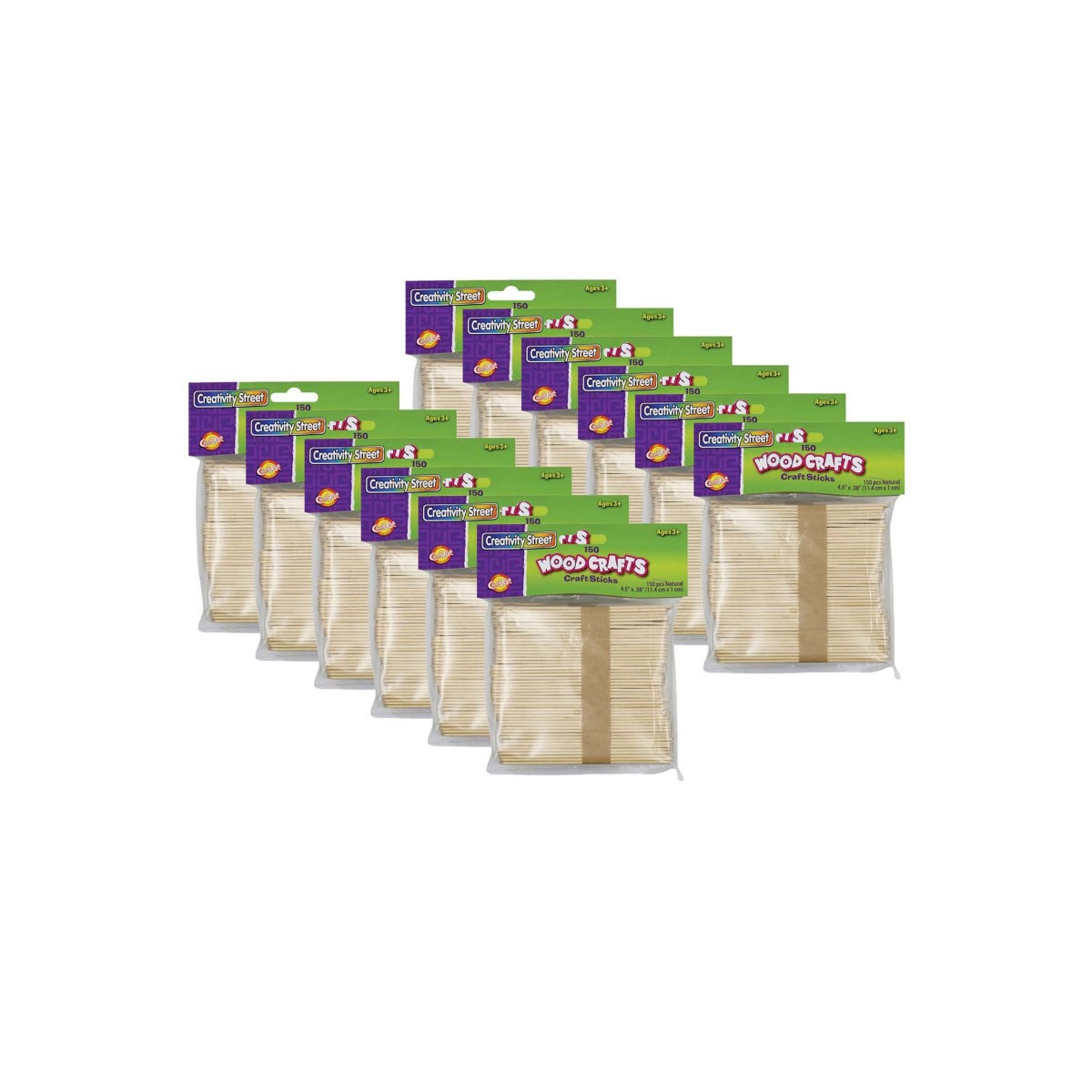"Ice cream stick" sized wood craft sticks are designed for a multitude of arts and crafts projects. Each stick is 4.5" long, 3/8" wide and 2 mm thick. These wood sticks accept many types of glue and paints, and are ideal for building 3D projects and structures. Construct a castle, build a bridge, or make a crate. Each pack includes 150 pieces. Sold as 12 packs for a total of 1800 sticks.