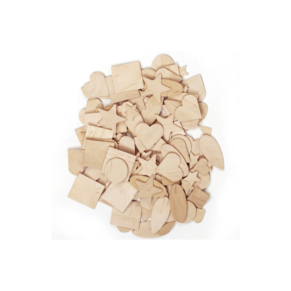 These Natural Wood Shapes include stars, hearts and other geometric shapes. Perfect for several arts and crafts applications. Pieces range from .5" to 2". Each pack includes 350 pieces.