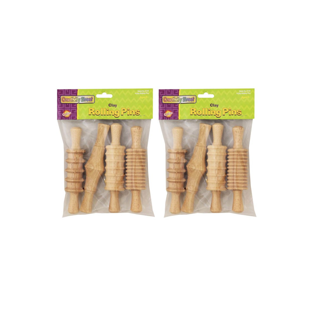 Children of all ages will enjoy the timeless pleasures of clay crafts. Provide students with the tools needed for hours of creative fun. Natural coated finish to protect wood and to prevent sticking of clay. 6-3/4" long, tip to tip. 1-1/2" diameter. Each set includes four clay rolling pins, each with a different design. Sold as 2 sets for 8 clay rolling pins total.