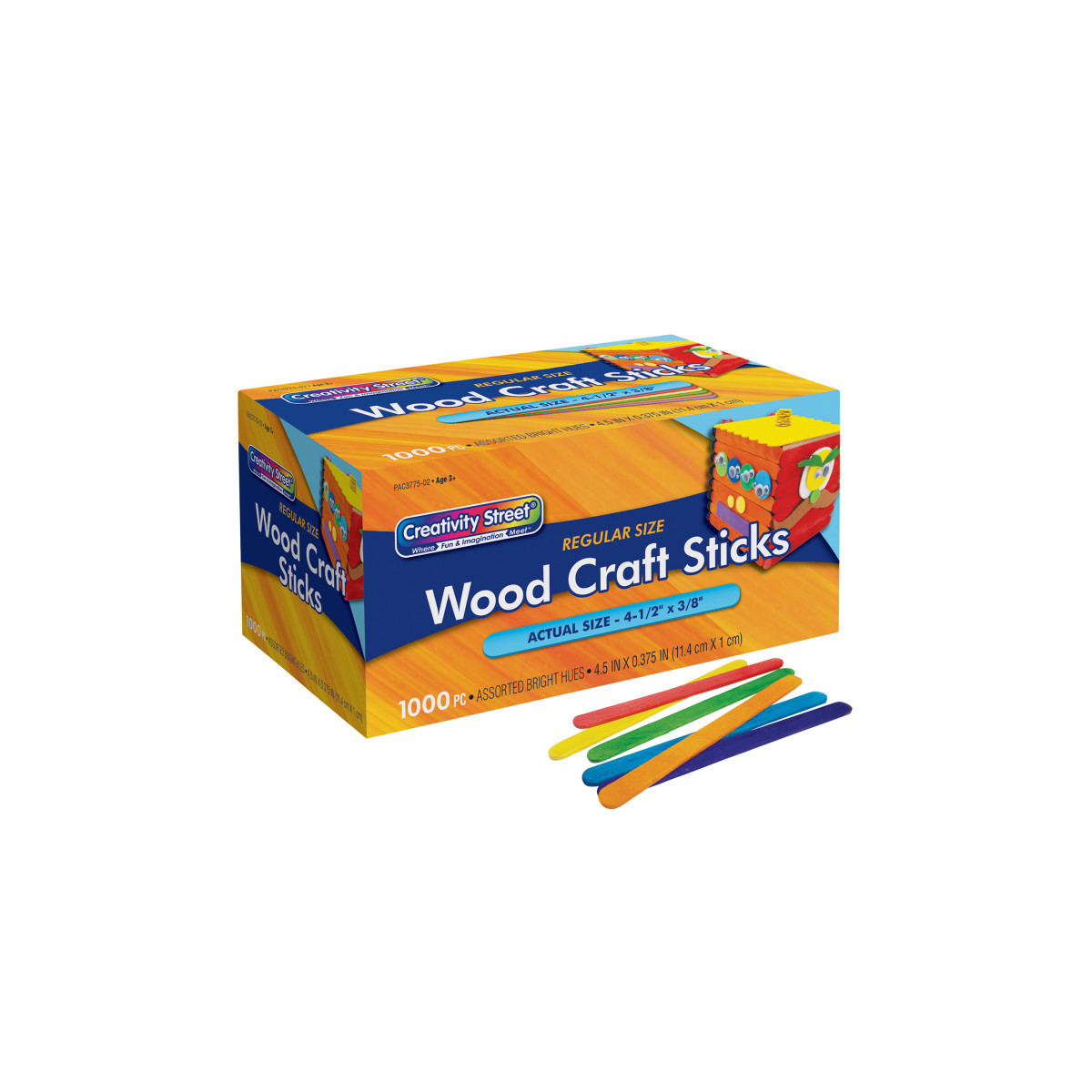 "Ice cream stick" sized wood craft sticks are designed for a multitude of arts and crafts projects. Ideal for use in counting lessons, patterning drills and crafts. Each stick is 4.5" long, .38" wide and 2 mm thick. Each pack includes 1000 pieces.