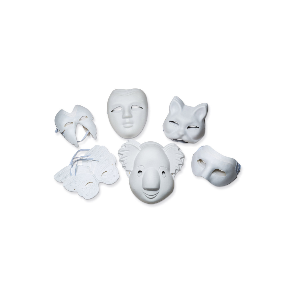 The smooth surface of these paperboard masks makes them ready to paint and decorate for wearing or simply for display. Includes four each of six fun designs: koala, cat, marauder, half and full butterfly and full face. Sturdy paperboard can be decorated with crayons, paints, markers and glued objects. Each pack includes 24 masks.