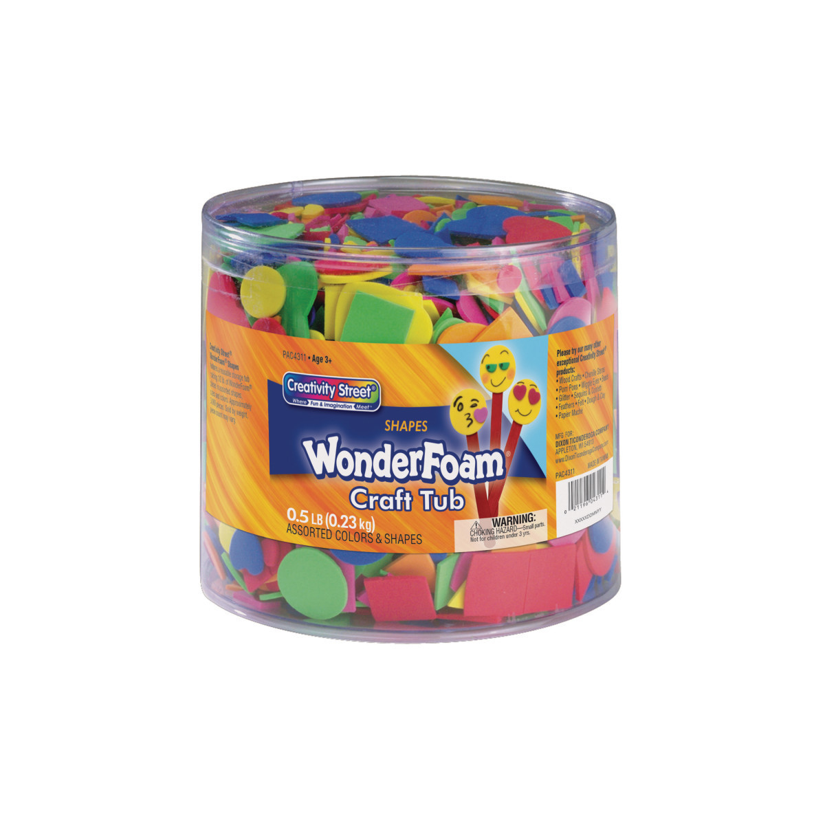 Neat and convenient, each reusable storage tub holds 1/2 pound of WonderFoam pieces in assorted shapes, sizes and colors. Approximately 3,000 pieces per tub. Sold by weight, piece count may vary. Add brightly colored foam shapes to your art and craft projects. Find endless creative uses for Wonder Foam such as costume additions, or for making vibrant pictures.