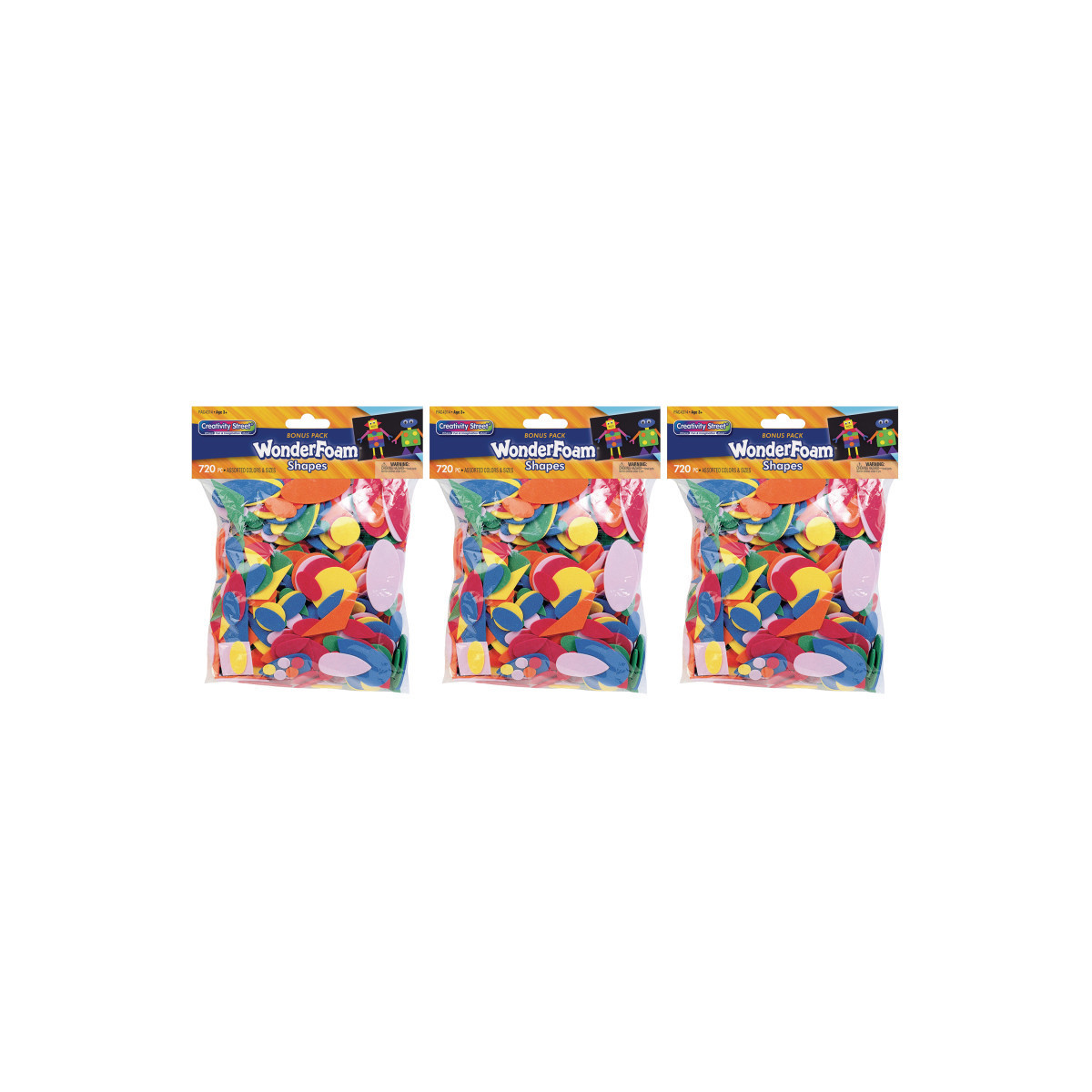 Bonus bag of 720 foam shape pieces in assorted sizes, shapes and colors. These WonderFoam shapes make craft projects or decorating fun. Each bag contains assorted shapes and sizes in bright assorted colors. Simply add glue and stick to any type of collage material. Sold as 3 packs of foam shapes.