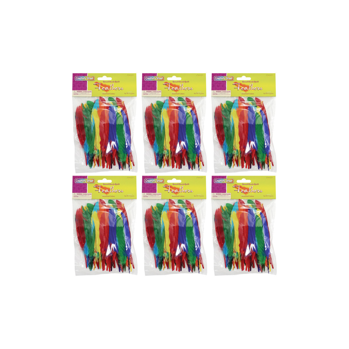 Duck quill feathers range in length from 3" to 5", in an assortment of bright colors. These non-toxic feathers are the perfect addition to any arts and crafts project! Glue or tape to masks, collages, and other mixed media projects. Each pack contains approximately 14 grams. Sold as 6 packs, 84 grams total.