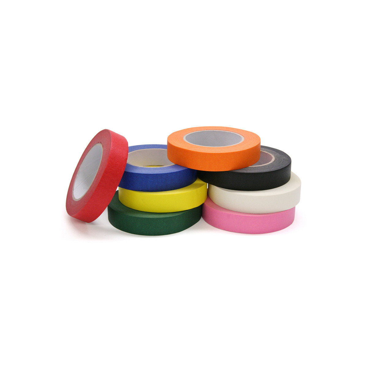 Classroom Pack of Assorted Colored Masking Tape. Colors are red, yellow, blue, green, purple, white, gray, black. Eight colors in all.