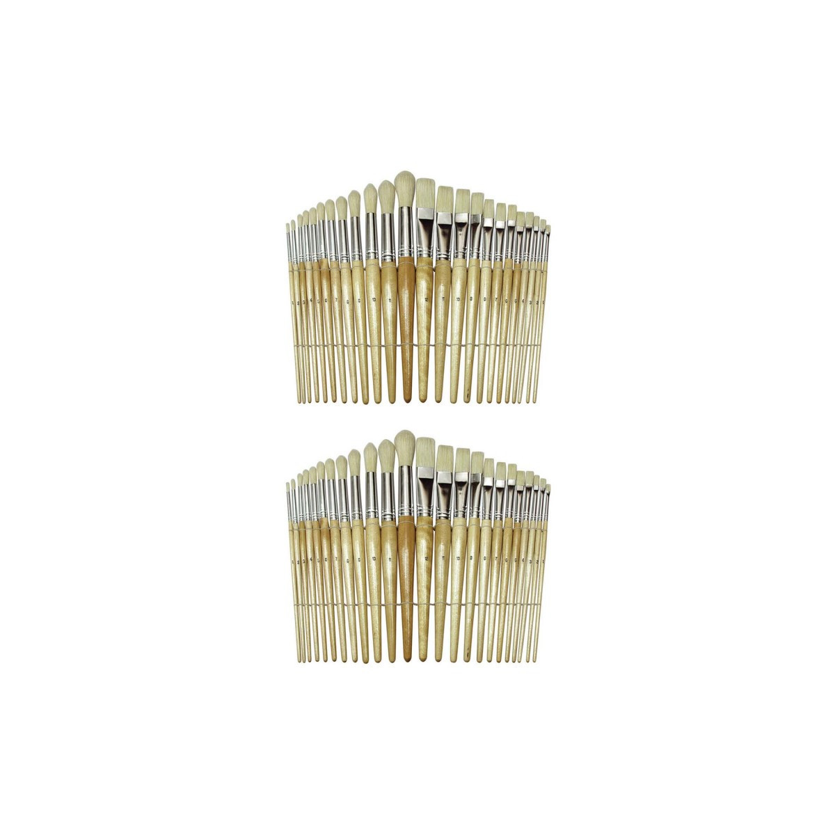 This 24 piece Preschool Brush Set includes 12 flat (#1 to #12) and 12 round brushes (#1 to #12) with seamless nickel plated ferrules, clear finish hardwood handles and natural hog bristles. These brushes are perfect for tempera paint. Sold as 2 packs, 48 paintbrushes total.