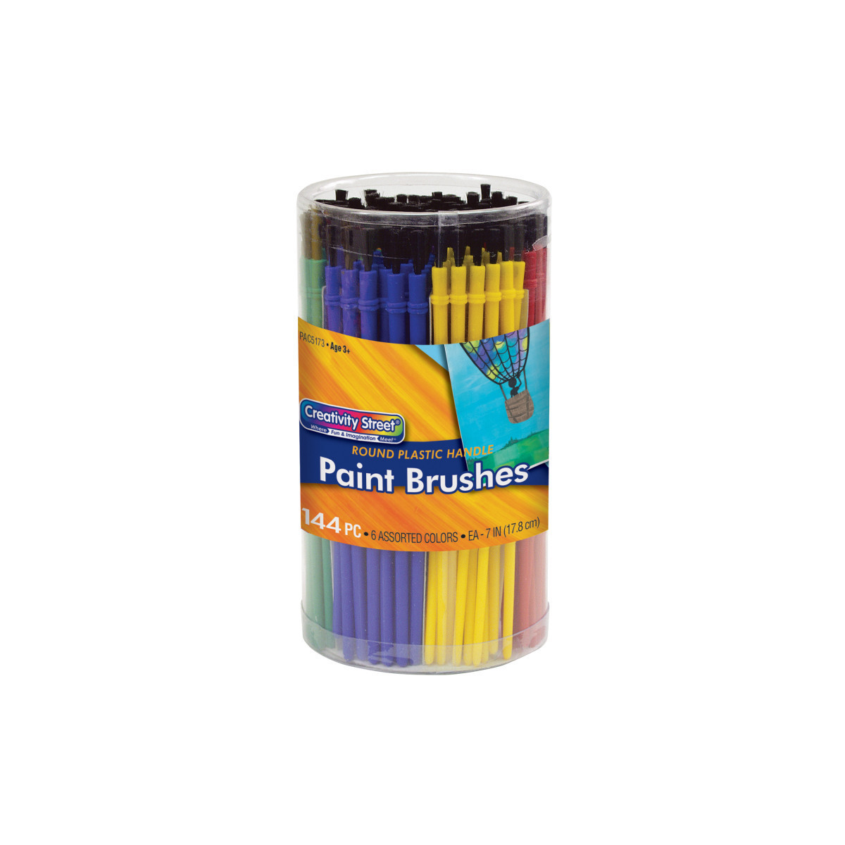 Durable plastic handled brushes available in durable plastic canister classroom packs for large groups. Each classroom pack includes 144 brushes, 24 each of six different colors: Blue, Green, Orange, Purple, Red and Yellow. Each of the round, short handled brushes feature plastic handles with blunt-tipped, synthetic bristles.