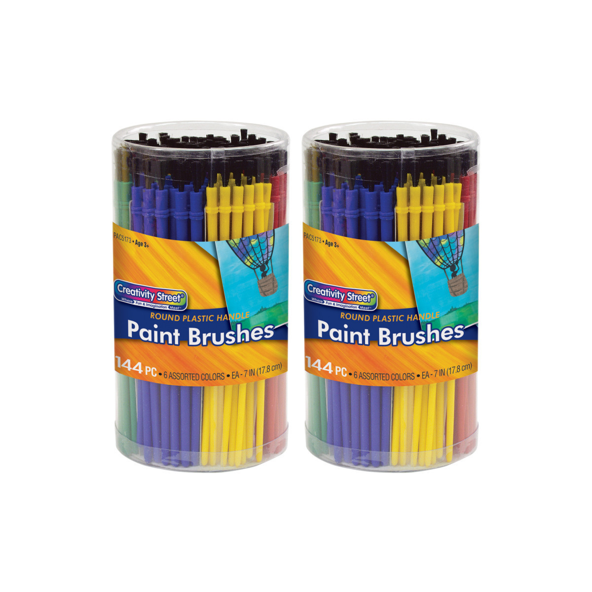 Durable plastic handled brushes available in durable plastic canister classroom packs for large groups. Each classroom pack includes 144 brushes, 24 each of six different colors: Blue, Green, Orange, Purple, Red and Yellow. Each of the round, short handled brushes feature plastic handles with blunt-tipped, synthetic bristles. Sold as 2 packs, 288 brushes total.