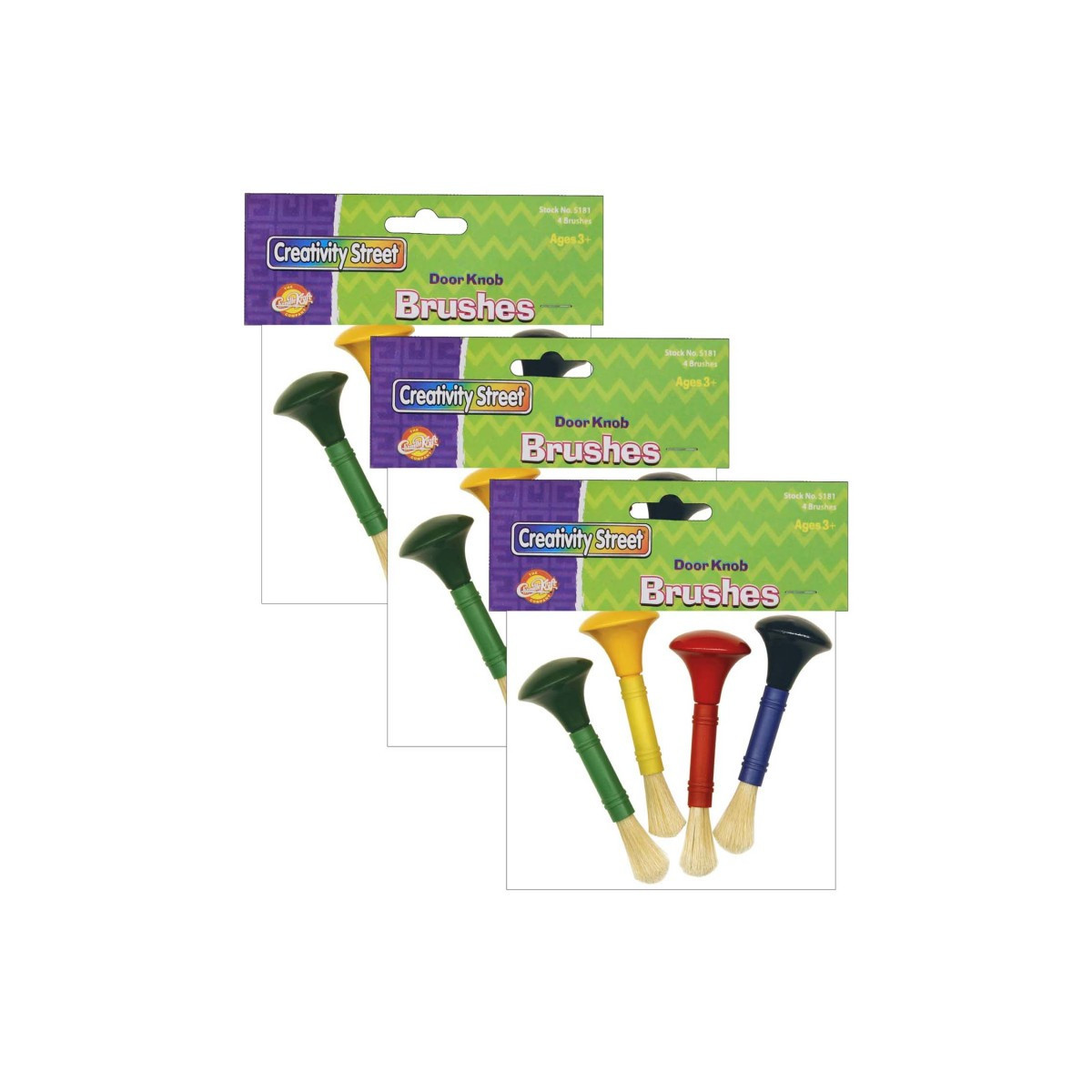Door Knob and Bulb Knob Brush Sets with easy-to-hold handles that fit perfectly into little hands. Brushes include plastic ferrules. Colors include Green, Yellow, Red and Blue. Each set includes 4 brushes. Sold as 3 sets for a total of 12 brushes.