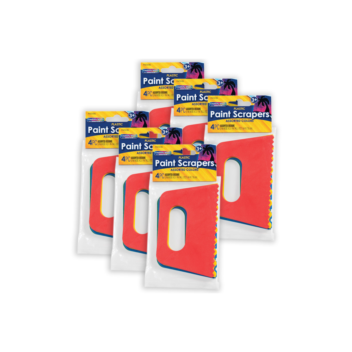 Durable set of all plastic paint scrapers in four different designs. Each scraper is 5" wide and allows kids to create patterns, blend different colors, and play with shapes and designs. Each set includes 4 scrapers. Sold as 6 sets of scrapers.