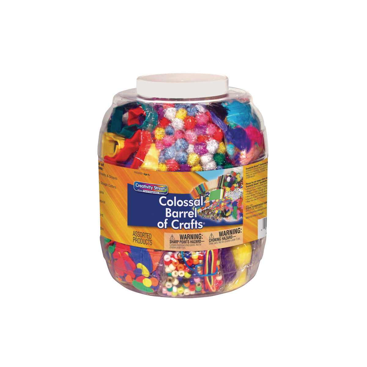 The Colossal Barrel of Crafts includes a tremendous assortment of popular craft items in a durable, reusable storage container. Includes Feathers, Pom Pons, Chenille Stems, Wiggle Eyes, Buttons, Dough Cutters, Modeling Clay, Glitter Poms, Jumbo Craft Sticks, WonderFoam® Shapes and Sheets, Sequins & Spangles, Pony Beads, Rainbow Cord and Glitter Glue Pens. Get ready for some COLOSSAL fun with clay!