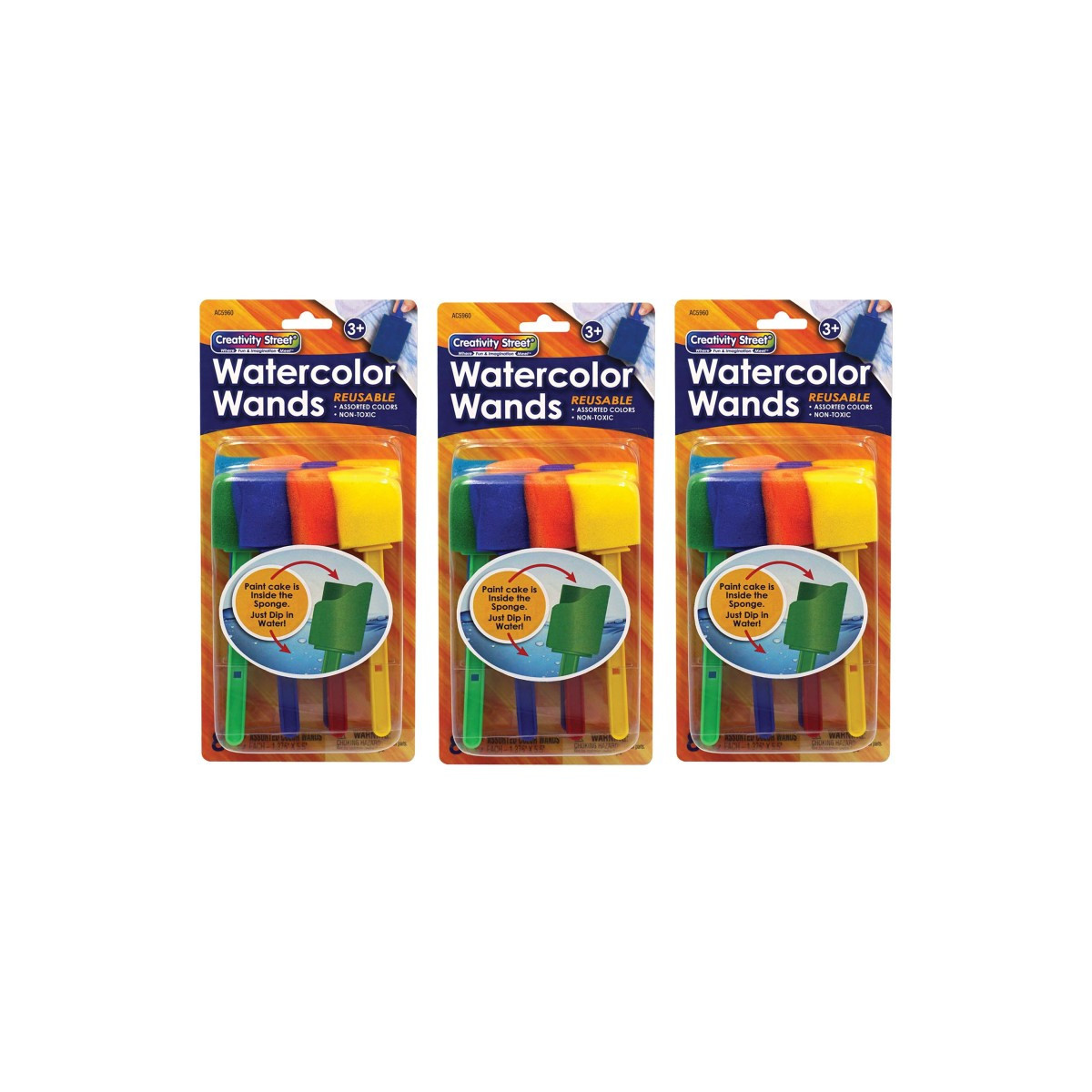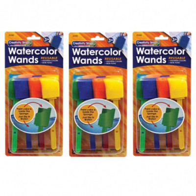 Watercolor paint cake is embedded inside the sponge to make these the most convenient and least messy watercolors to use. Simply dip the brush in water for a few seconds, blot and its ready to use! Reusable and washable. Each pack includes 8 colors/wands. Sold as 3 packs for a total of 24 paint wands.