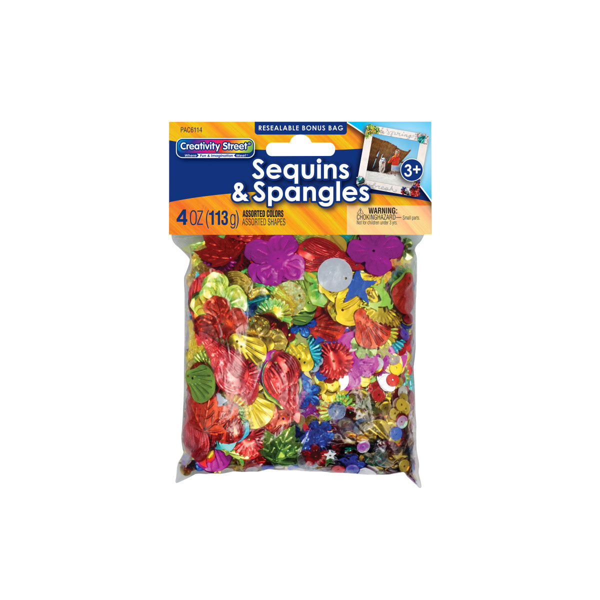 Sequins and Spangles assortment includes a variety of shapes, styles, sizes and colors to choose from. Glittery, metallic and holographic shapes and sequins can be used on clothing, costumes, art projects and more. Each pack includes 4 oz. assortment of sequins and spangles in a variety of shapes, colors and textures.