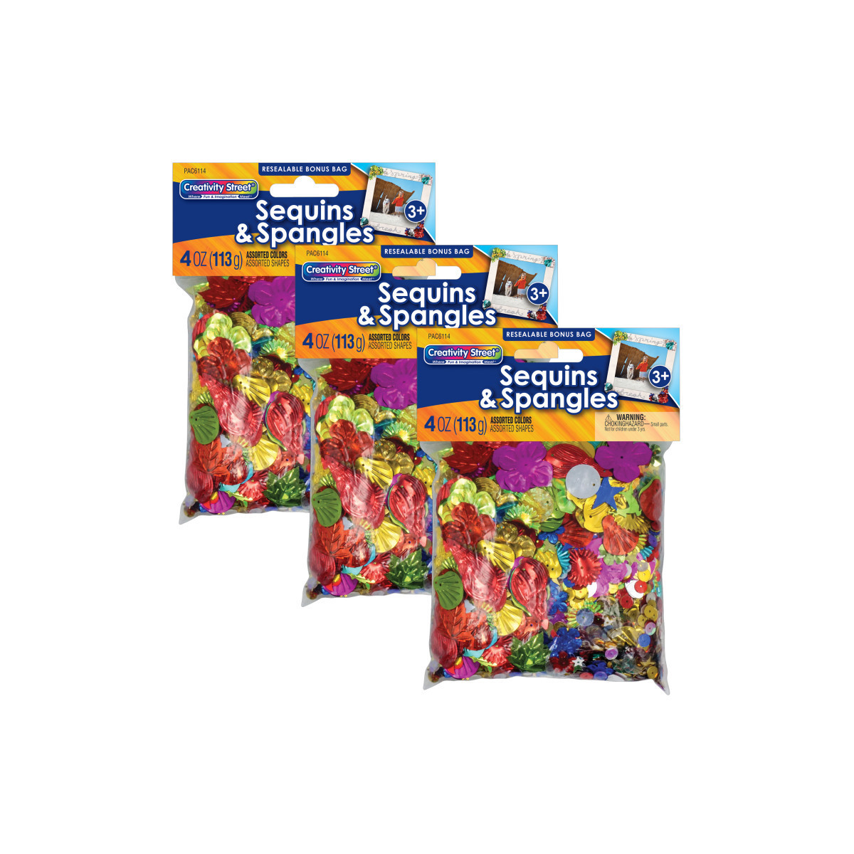 Sequins and Spangles assortment includes a variety of shapes, styles, sizes and colors to choose from. Glittery, metallic and holographic shapes and sequins can be used on clothing, costumes, art projects and more. Each pack includes 4 oz. assortment of sequins and spangles in a variety of shapes, colors and textures. Sold as 3 packs for a total of 12 oz.