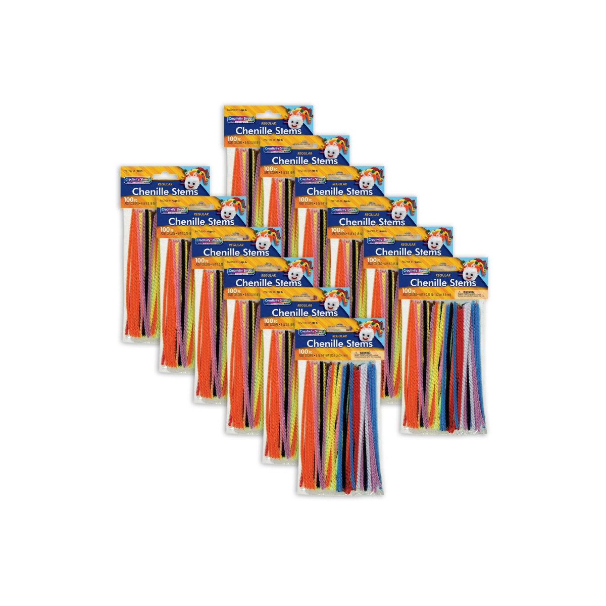 Pack of 100 regular size stems in assorted colors. Each piece is 6" x 4mm and packaged in a poly bag with header. Sold as 12 packs for a total of 1200 stems.