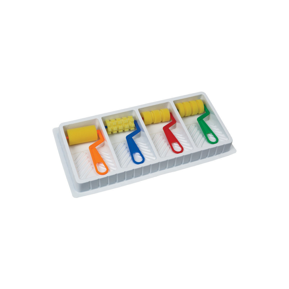 Perfect for the classroom, this set contains four easy-to-clean paint rollers in different patterns and a durable, four-section plastic paint tray. The color-coded, easy-grip plastic handles have a hanging loop for ease of drying and storage. Great for arts and crafts projects! Set contains 4 foam paint rollers with distinctive patterns in a 4 well paint tray.