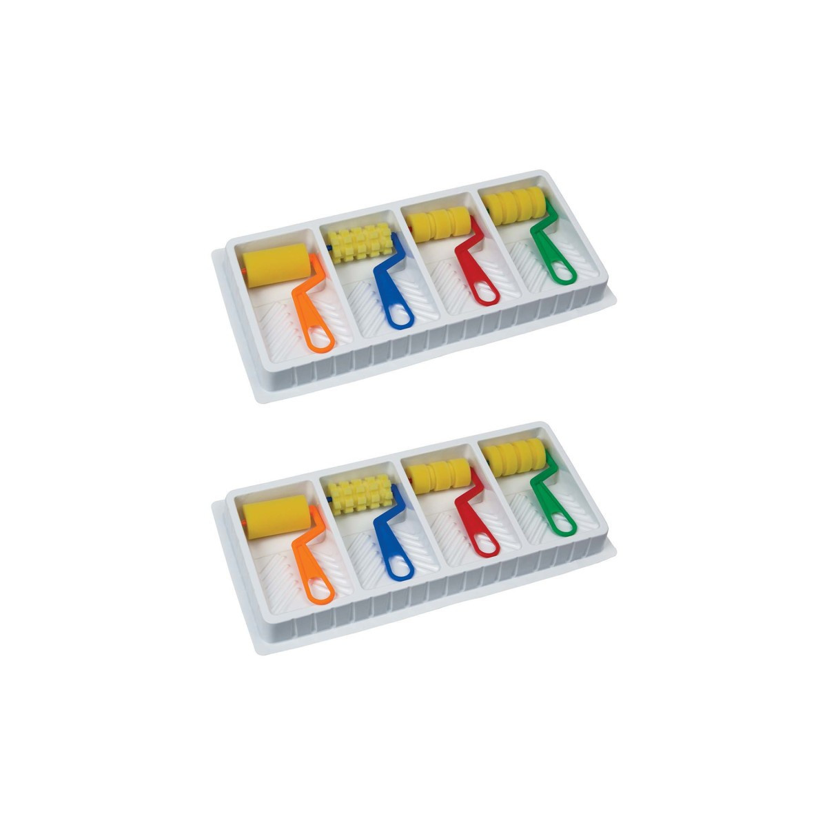 Perfect for the classroom, this set contains four easy-to-clean paint rollers in different patterns and a durable, four-section plastic paint tray. The color-coded, easy-grip plastic handles have a hanging loop for ease of drying and storage. Great for arts and crafts projects! Set contains 4 foam paint rollers with distinctive patterns in a 4 well paint tray. Sold as 2 sets.