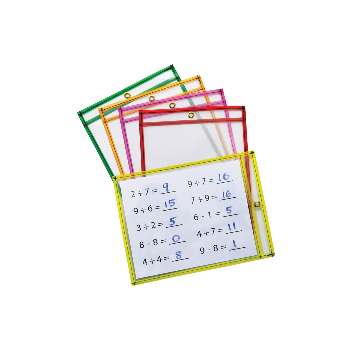 Dry erase pockets allow children and teachers to reuse documents or coloring sheets for endless hours of learning and fun. The Large 9" x 12" pocket is specially designed to fit 8-1 /2" x 11" documents so teachers and parents can print worksheets or games at home or at school for children to use. Neon color assortment includes Green, Orange, Pink, Red and Yellow. Each pack includes 10 pockets.