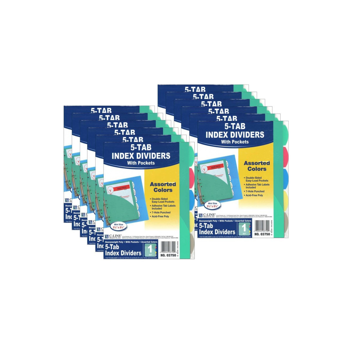 Although mini in size, this item has proved to offer large organizational benefits. Each set of dividers come in an colorful assortment of five dividers. The double-sided, easy-load slant pockets allow for extra storage of documents and media. Each set includes write-on tab labels to help identify the sections within the binder. The assortment of colors and storage options allows individuals to customize their binders to organize documents as they prefer. The versatile dividers are 7-hole punched, allowing them to fit in standard 3-ring 5.5 x 8.5, 6 x 9 or 8.5 x 11 binders. On-the-go organization is easy with C-Line's document storage additions! Note: If using a day planner, please check the actual product dimensions and hole punch configuration; does not work with all day planner systems. Each set includes 5 dividers. Sold as 12 sets.