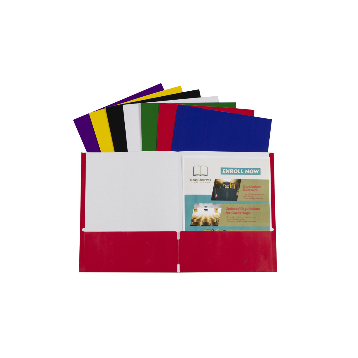 Stay organized with this versatile two-pocket portfolio, perfect for storing and protecting your 11" x 8.5" documents. Designed without prongs for a sleek, streamlined look, this folder features two spacious interior pockets and two convenient business card slots—ideal for presentations, schoolwork, or professional use. Suitable for all ages, these folders help keep papers neat and accessible whether you're in the classroom, office, or at home. Sold individually in assorted colors including red, yellow, green, blue, purple, black, and white (color is randomly selected; no color choice available).