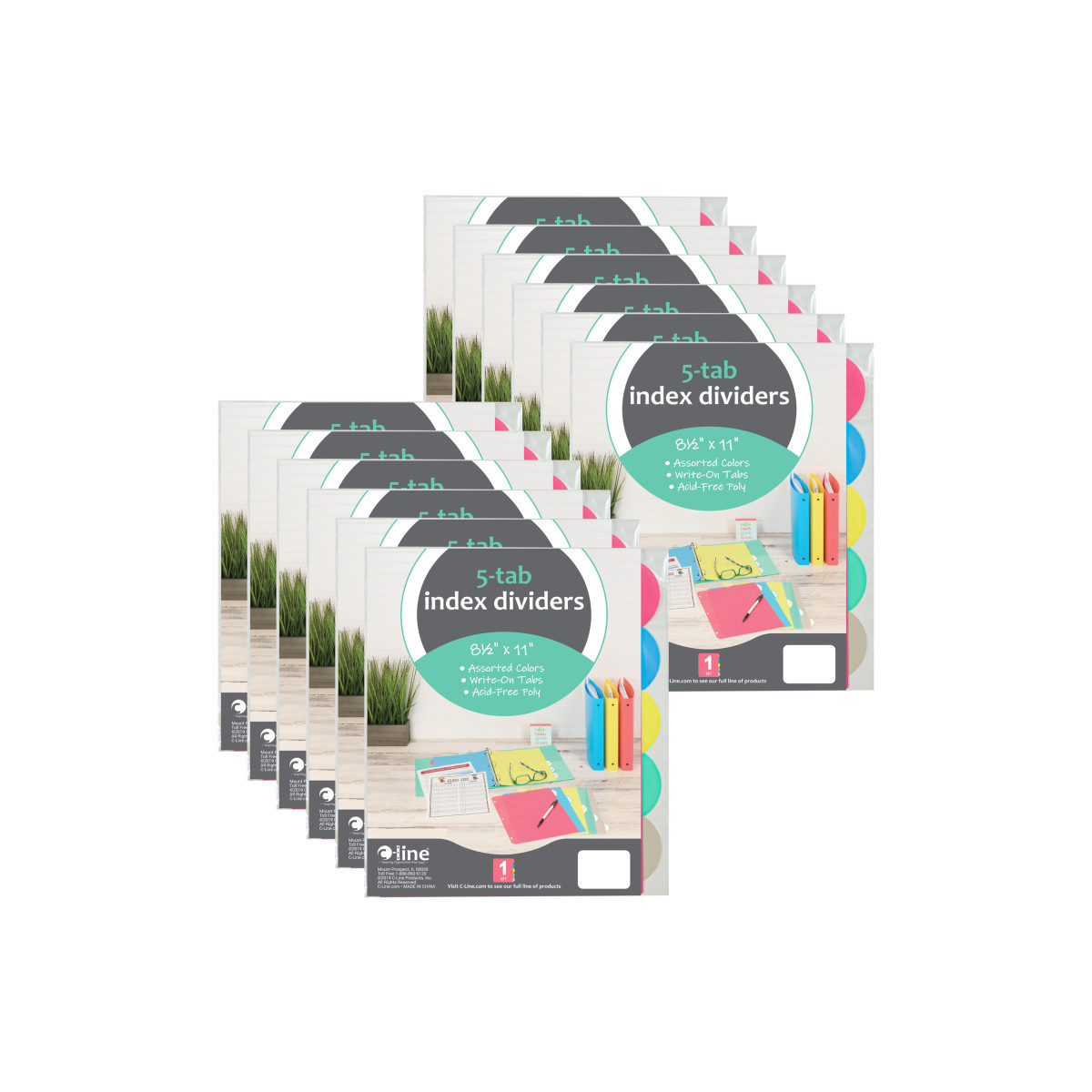 Tabbed index dividers organize your binder instantly. Made from durable, acid-free polypropylene. Fits standard 3-ring binders. Adhesive tab labels included. Each set includes 5 dividers in assorted Tropic Tones colors: Seaside Blue, Sunny Yellow, Seafoam Green, Sunset Red, and Sandy Gray. Sold as 12 sets for a total of 60 dividers.
