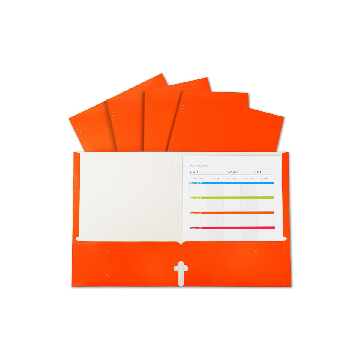 Two-pocket paper portfolios/folders with 3-hole punch hold papers and resist tearing. Laminated, high-gloss finish catches your eye. Vibrant colors let you organize by subject, project and more! Great for school, home or office. Folders feature 3-hole punch with 2 business card slots. Without prongs. For 8.5" x 11" document storage. Box of 25. Orange.