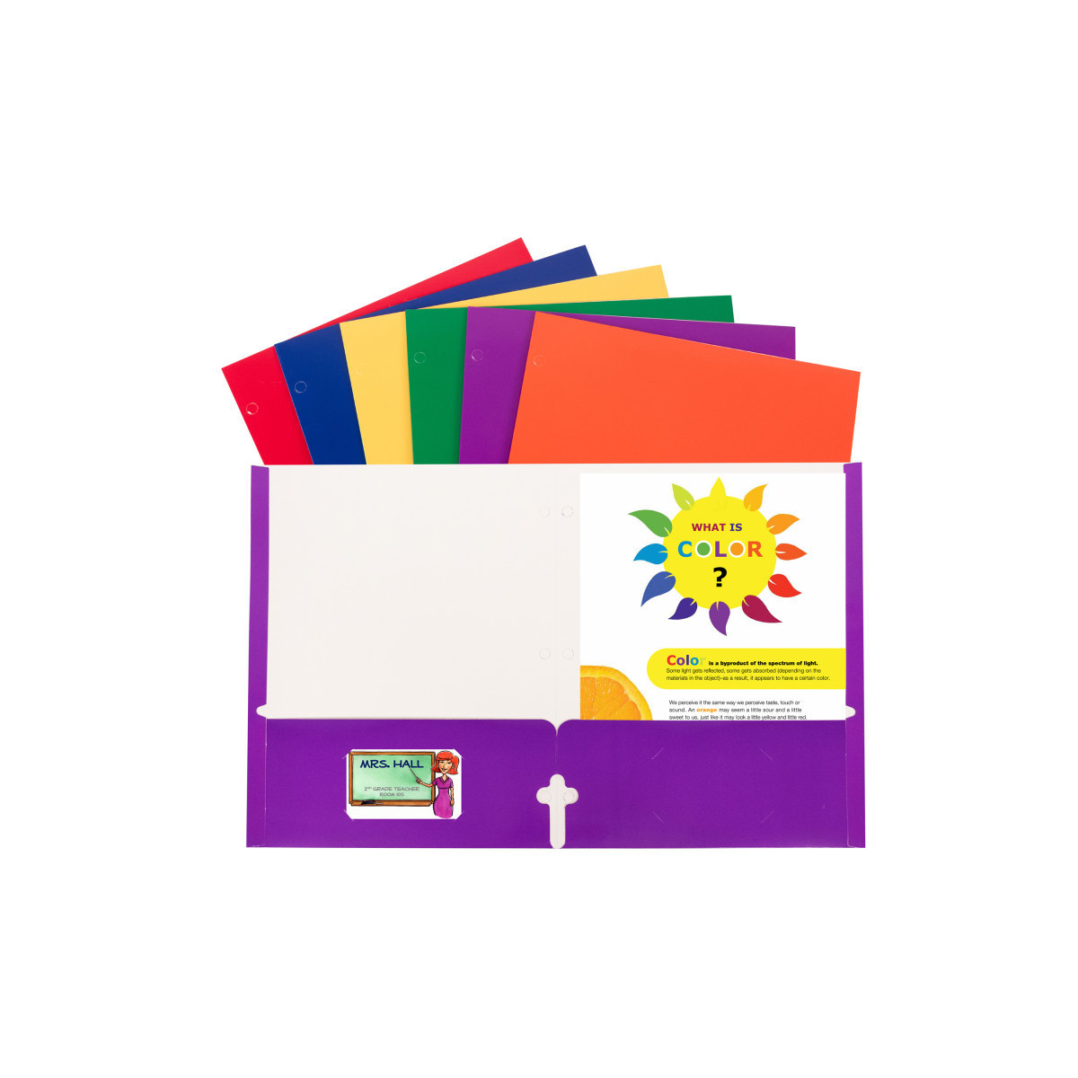 2-pocket paper portfolios/folders with 3-hole punch hold papers and resist tearing. Laminated, high-gloss finish catches your eye. Vibrant primary colors let you organize by subject, project and more! Great for school, home or office. Folders feature 3-hole punch with 2 business card slots. Without prongs. For 8-1/2 x 11 document storage. Pack of 50 in assorted primary colors: Red, Blue, Green, Yellow, Orange and Purple.