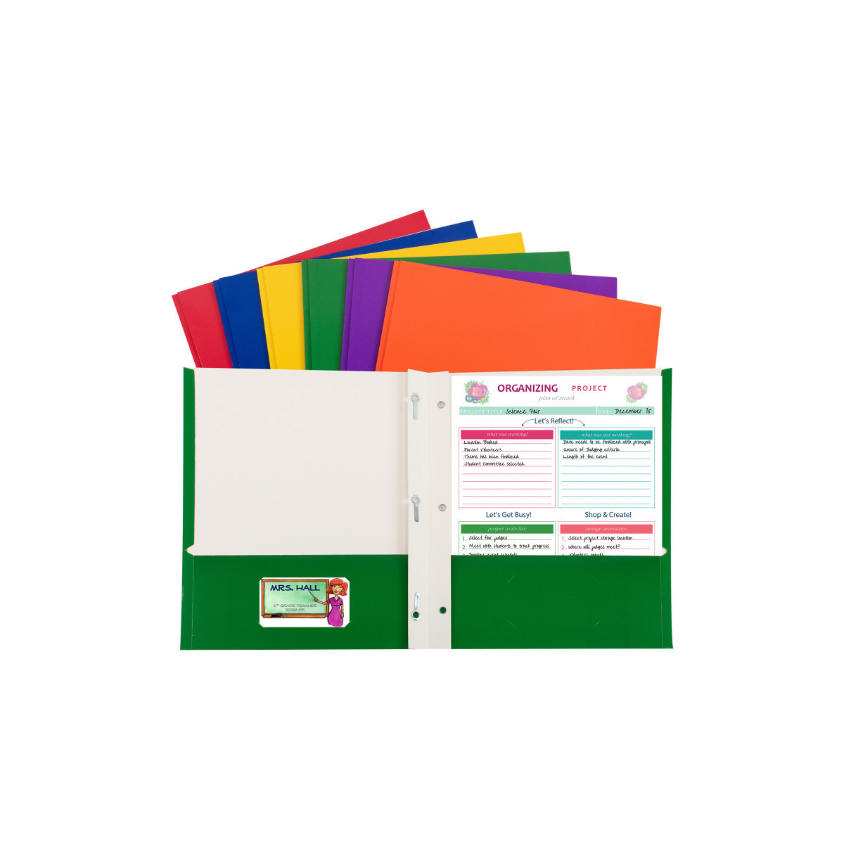 2-pocket paper portfolios/folders with prongs hold papers and resist tearing. Laminated, high-gloss finish catches your eye. Vibrant primary colors let you organize by subject, project and more! Great for school, home or office. Folders feature 2 business card slots. With prongs. For 8-1/2 x 11 document storage. Pack of 50 in assorted colors: Red, Blue, Green, Yellow, Orange and Purple.
