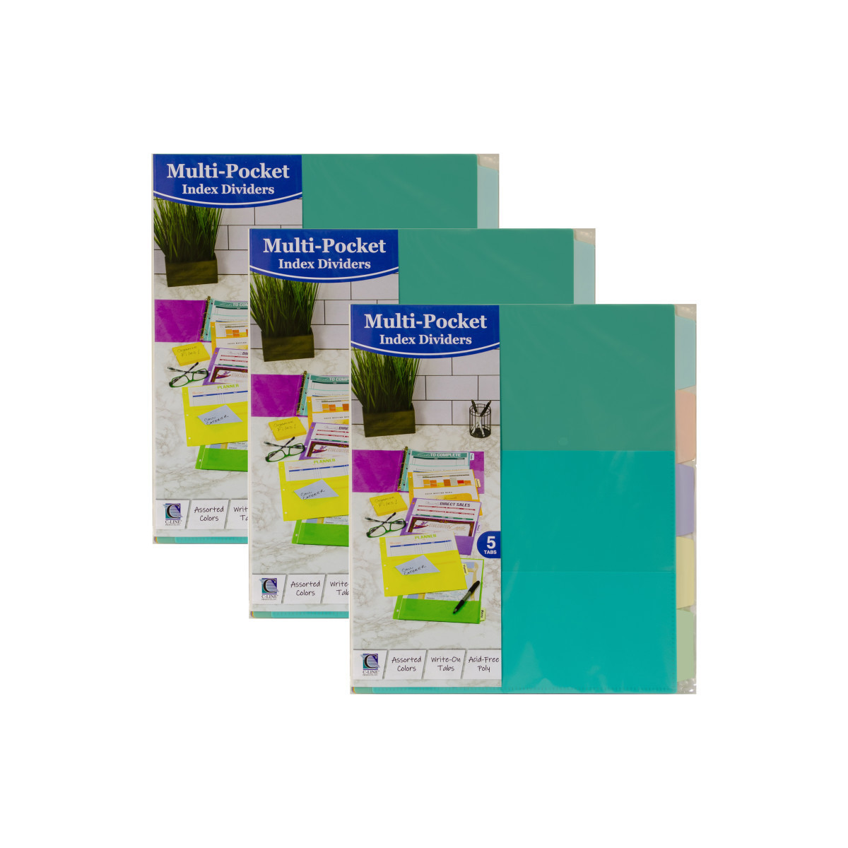 When storing pages in a binder, it can be valuable to create sections that help to refer to specific material. This will eliminate having to search through the entire binder. Index dividers are commonly paired with binders to help divide and organize the information. The Multi-Pocket Index Dividers not only create information sections within the binder, but they add additional storage space for loose papers. Use the acid-free polypropylene dividers to store up to 8-1/2 x 11 size documents and smaller. Write-on index tabs allow you to instantly categorize your binder and label each section to make it easy to reference. Use a pencil, ball point pen or permanent marker to label each tab. Each divider features two pockets making it possible to organize pages, business cards, notes and more. Bright color assortment includes green, orange, purple, turquoise and yellow. Each set includes 5 dividers. Sold as 3 sets for a total of 15 dividers.
