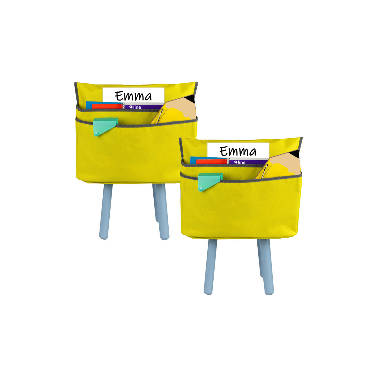 This innovative product uses the student's chair to become a supply storage place for folders, binders, storage boxes and more. Made with dual pockets, the Chair Cubbie™ simply slides over the top of the chair to instantly create more storage locations within the student's desk space. Use this unique product in classroom settings to keep supplies organized, yet accessible to each student. Sized to fit chairs that measure 10" or less on the top. Sold as a pack of 2 Chair Cubbies.
