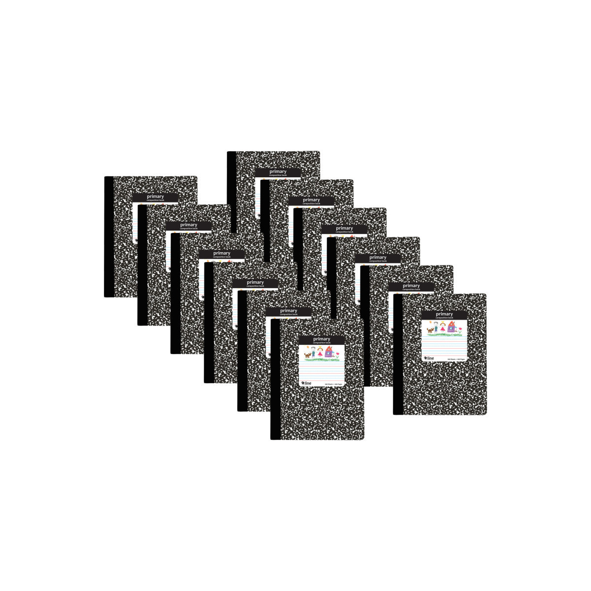 Help students improve writing and drawing skills with C-Line's Primary Composition Book. Students can draw pictures and create stories using their primary comp book. Pages feature primary ruling for story writing and a blank space for illustrations. The wide-ruled bottom portion of the page contains a red baseline and dotted lines to aid in letter positioning while the top portion of the page is unruled and can be used to draw pictures to bring the story to life! Great for beginner students to reinforce proper handwriting skills. Ideal for note-taking and story development. Bright white paper in wide-ruled format allows space for neat writing. Each notebook has 100 sheets sewn into the heavyweight covers to protect the content inside. Black marble design on the front and back cover. Inside front cover shows alphabet and numbers. Inside back cover illustrates "How To Write A Story". Good for grades K-2. Size is 7.5" x 9.75". Sold as a pack of 12 composition books.