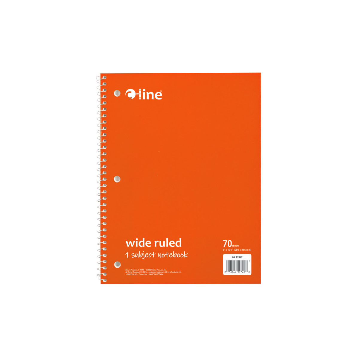 Instantly create writing space in binders and folders, by inserting the Spiral-Bound 1-Subject Notebook. Perfect for students and professionals, these notebooks feature a durable cover that helps protect the content written on the pages inside. Wide ruled format: the bright white paper has blue handwriting lines with a red margin divider to allow for neat writing. Solid colored front cover adds style to notebooks, while also making it easy to organize projects or classes by color. Attach this 3-hole punched spiral notebook into a standard 3-ring binder to create the ultimate organizational tool that keeps all your notes and hand-outs in one place. Perforated edges reduce paper waste by allowing pages to tear out neatly. 70-page spiral bound notebook.