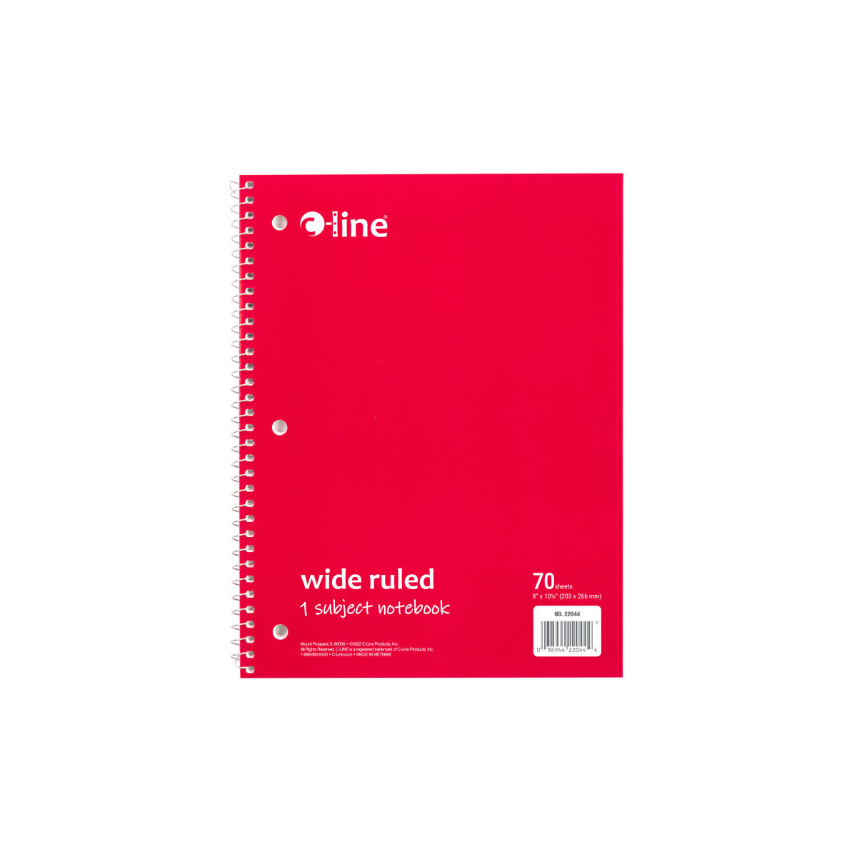 Instantly create writing space in binders and folders, by inserting the Spiral-Bound 1-Subject Notebook. Perfect for students and professionals, these notebooks feature a durable cover that helps protect the content written on the pages inside. Wide ruled format: the bright white paper has blue handwriting lines with a red margin divider to allow for neat writing. Solid colored front cover adds style to notebooks, while also making it easy to organize projects or classes by color. Attach this 3-hole punched spiral notebook into a standard 3-ring binder to create the ultimate organizational tool that keeps all your notes and hand-outs in one place. Perforated edges reduce paper waste by allowing pages to tear out neatly. 70-page spiral bound notebook. Colored front cover, gray board back cover. Red. Sold individually.