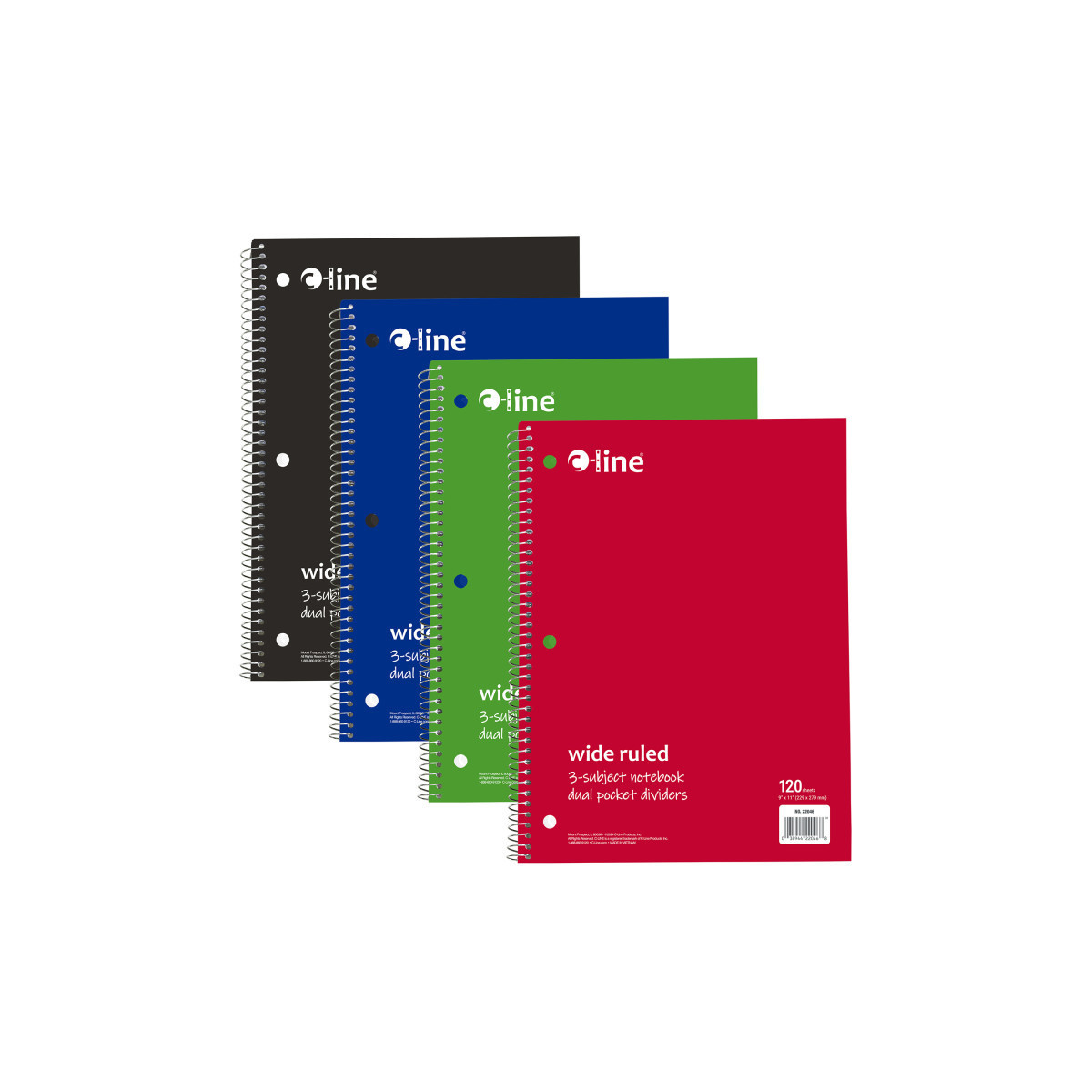 Instantly create writing space in binders and folders, by inserting the Spiral-Bound 3-Subject Notebook. Perfect for students and professionals, these notebooks feature a durable cover that helps protect the content written on the pages inside. Wide ruled format: the bright white paper has blue handwriting lines with a red margin divider to allow for neat writing. Solid colored front cover adds style to notebooks, while also making it easy to organize projects or classes by color. Attach this 3-hole punched spiral notebook into a standard 3-ring binder to create the ultimate organizational tool that keeps all your notes and hand-outs in one place. Perforated edges reduce paper waste by allowing pages to tear out neatly. 120-sheet spiral bound notebook with 2 dividers with pockets to keep subjects organized. Colored front cover, gray board back cover. Sold individually in assorted colors (no color choice).