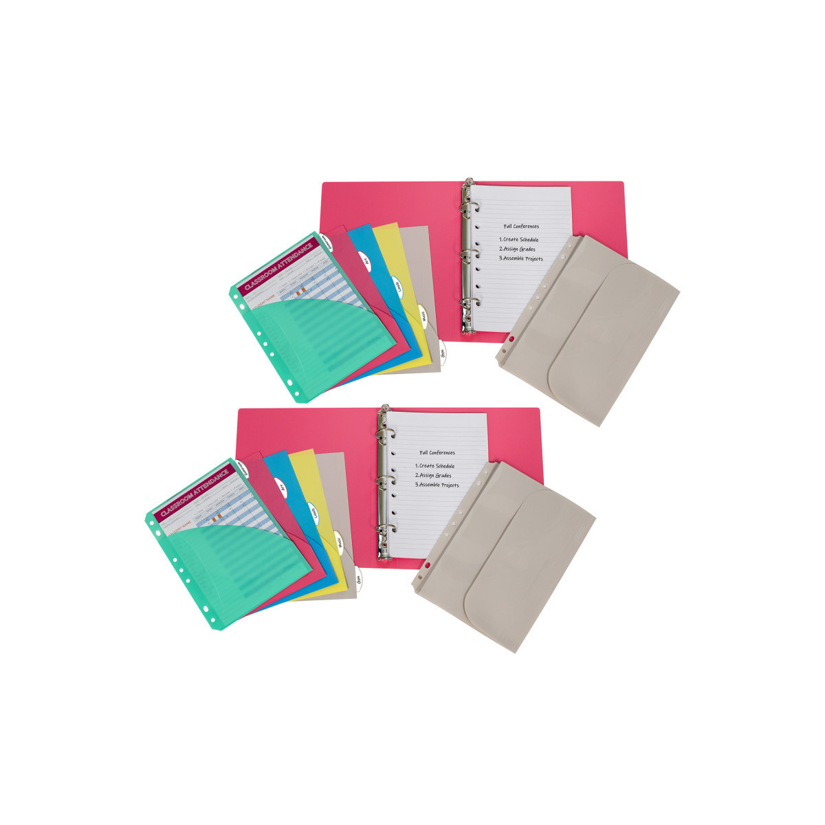 One convenient kit gets you started in the latest trend in miniature organization. Create your own planner or address book in a matter of minutes. It is made of the same durable material as other C-Line binders, but offers a more compact storage option. Whether you are looking to create your own daily planner or would like a way to sort store coupons, this starter kit is ideal. Features the essential items needed for on-the-go organization. The kit is ideal for the storage of papers, items, and more up to 5-1/2 x 8-1/2 in size. Each kit includes one mini poly binder, 1 set of mini poly index dividers with pockets, 50 sheets of mini filler paper and one mini poly binder pocket with hook and loop closure. Accessory items are universally punched to fit in standard 5-1/2 x 8-1/2, 6 x 9 and 8-1/2 x 11 binders. Plastic items are made from durable, heavyweight polypropylene. Kit components come in assorted colors: binder is Seaside Blue or Sunset Red, index divider set is Seafoam Green, Sunset Red, Seaside Blue, Sunny Yellow, and Sandy Gray; paper is white with black ruled lines; binder pocket is Sandy Gray. Sold as a pack of 2 kits.