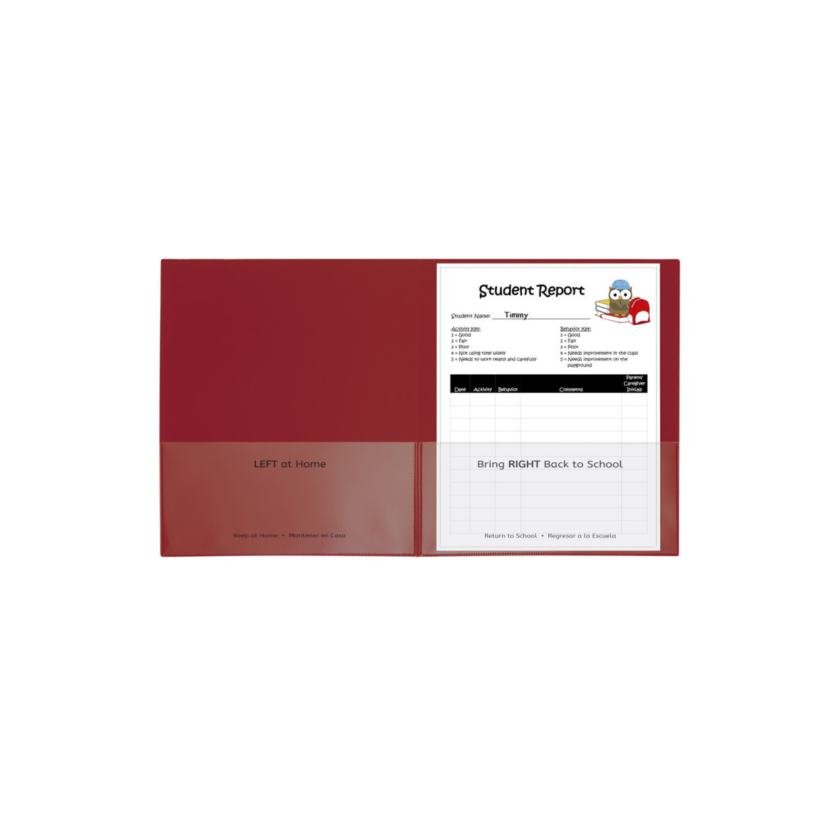 Make the connection between school and home stronger with these school-to-home two-pocket folders. Keep parents and caregivers informed with daily updates on lessons, projects, behavior and more. The interior pockets are imprinted with 'Home' and 'School' designations, in both English and Spanish. Front and back cover pockets are clear, making them great for custom student cover sheets. Made of durable, acid-free polypropylene. Red. Box of 25.