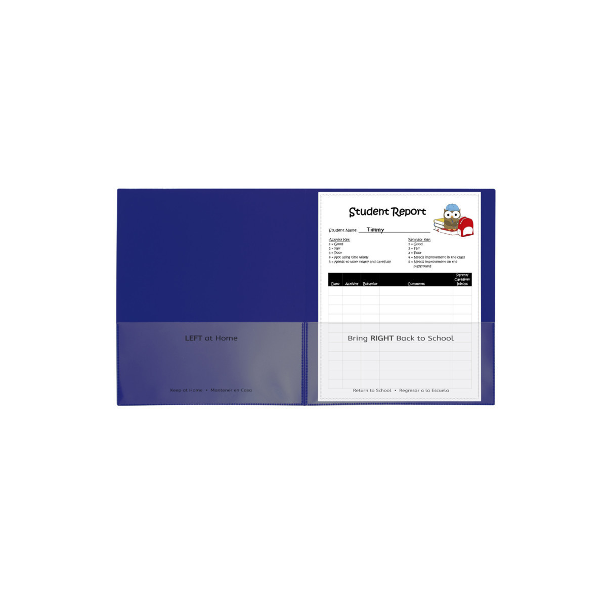 Make the connection between school and home stronger with these school-to-home two-pocket folders. Keep parents and caregivers informed with daily updates on lessons, projects, behavior and more. The interior pockets are imprinted with 'Home' and 'School' designations, in both English and Spanish. Front and back cover pockets are clear, making them great for custom student cover sheets. Made of durable, acid-free polypropylene. Blue. Box of 25.