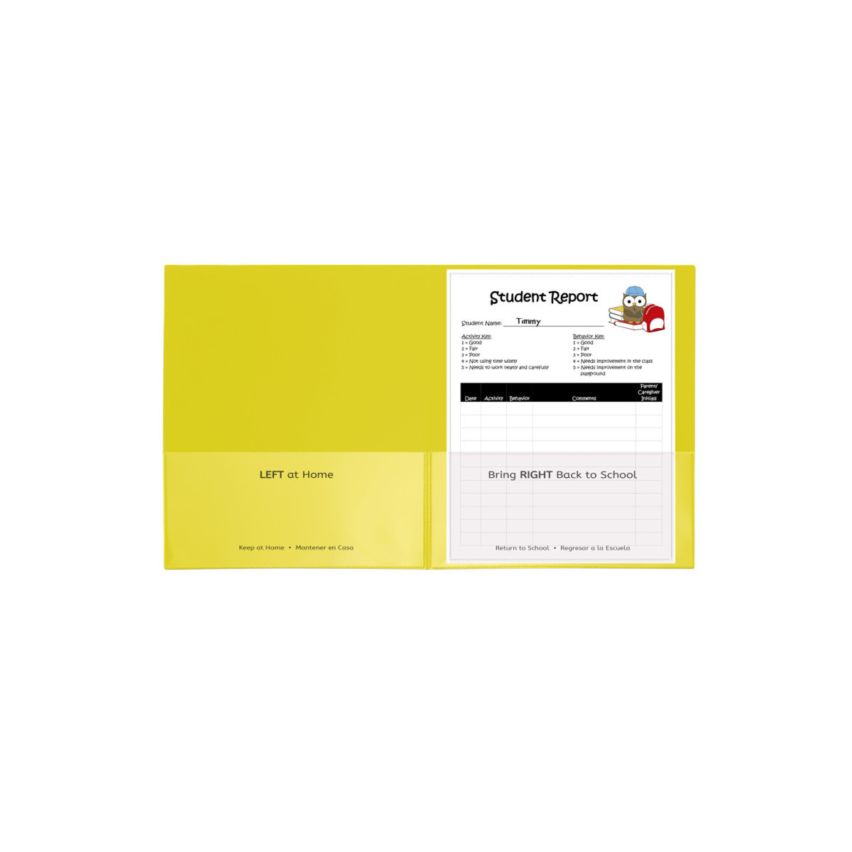Make the connection between school and home stronger with these school-to-home two-pocket folders. Keep parents and caregivers informed with daily updates on lessons, projects, behavior and more. The interior pockets are imprinted with 'Home' and 'School' designations, in both English and Spanish. Front and back cover pockets are clear, making them great for custom student cover sheets. Made of durable, acid-free polypropylene. Yellow. Box of 25.