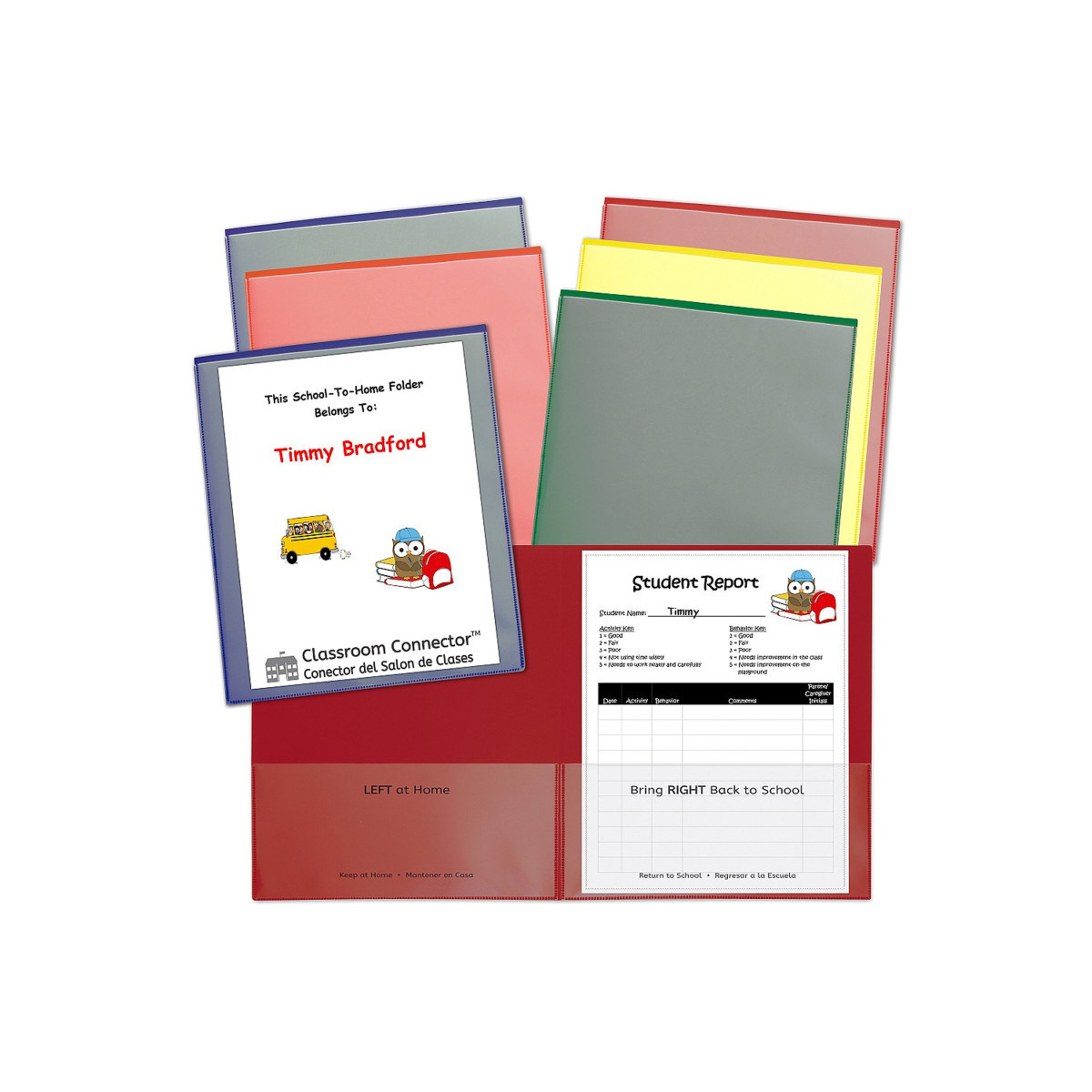 Make the connection between school and home stronger with these school-to-home two-pocket folders. Keep parents and caregivers informed with daily updates on lessons, projects, behavior and more. The interior pockets are imprinted with 'Home' and 'School' designations in both English and Spanish. Front and back cover pockets are clear, making them great for custom student cover sheets. Made of durable, acid-free polypropylene. Assorted colors include red, orange, yellow, green, blue and purple. Book measures 9.75" X 7.5".