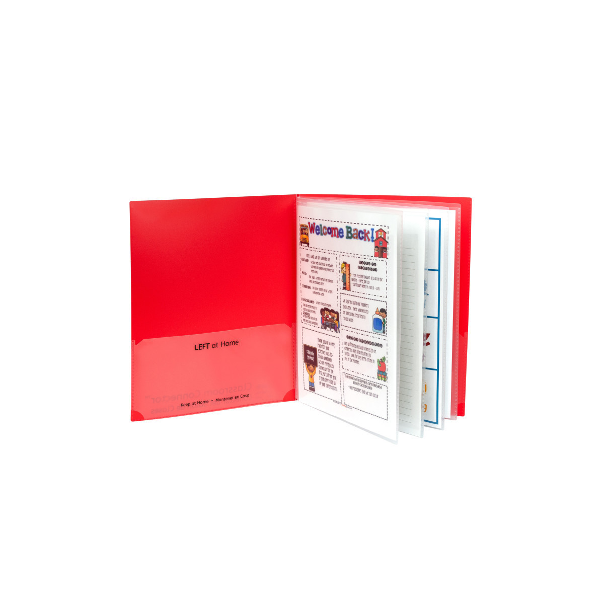 Four document sleeves are located along the middle of the folder. The standard folder pockets are imprinted with 'Home' and 'School' designations, in both English and Spanish. Front and back cover pockets are clear, making them great for custom student cover sheets. Made of durable, acid-free polypropylene. A great place to store classroom contact sheets, monthly lunch schedules and more. Box of 15.